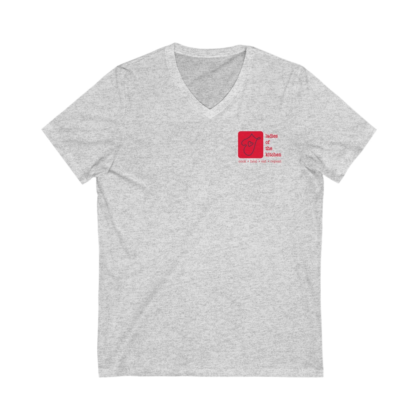 Ladies Of The Kitchen Small Logo Front. Unisex Jersey Short Sleeve V-Neck Tee
