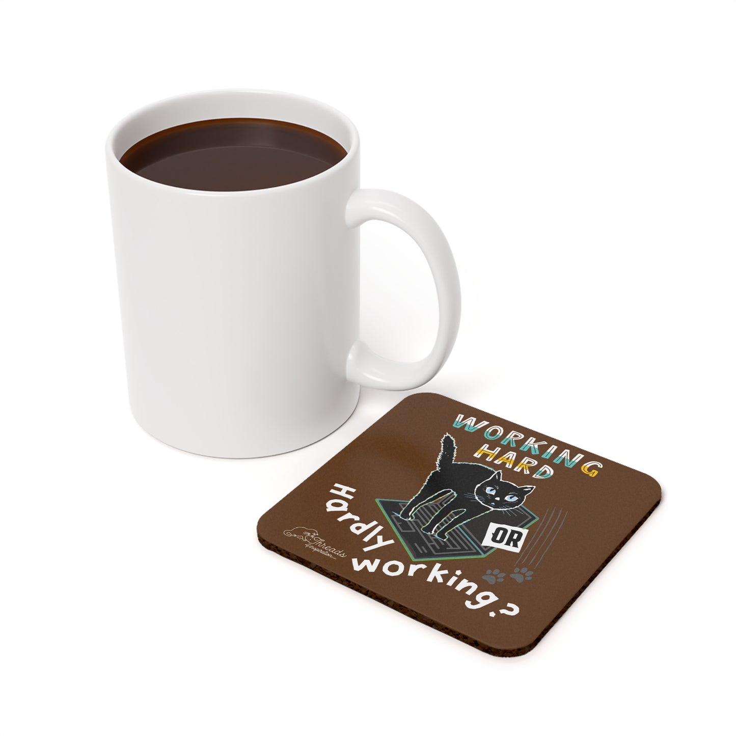 Cat Working Hard Hardly Working Coaster. Cork Back Coaster