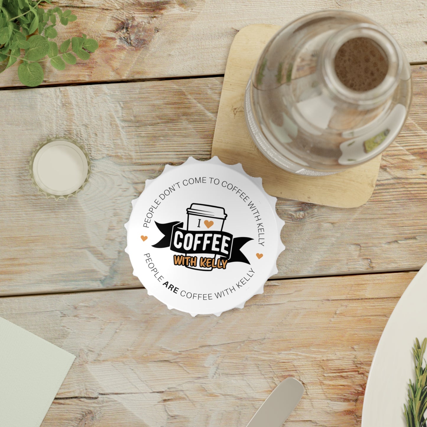 Coffee With Kelly Bottle opener. Introducing our unique Bottle Opener! This stylish accessory brings a burst of color and functionality to your gatherings. Designed with vibrant prints, it instantly adds a cheerful vibe to any occasion, making it perfect for barbecues, parties, and casual get-togethers with friends. Ideal for adults who appreciate both style and practicality, this bottle opener is a great gift for the beer lover or party host in your life. Celebrate special occasions like birthdays, housewarmings, and holidays with this must-have tool that effortlessly combines art with daily life. Perfect for those who love to entertain or simply enjoy a refreshing beverage, it's a delightful addition to any home bar.