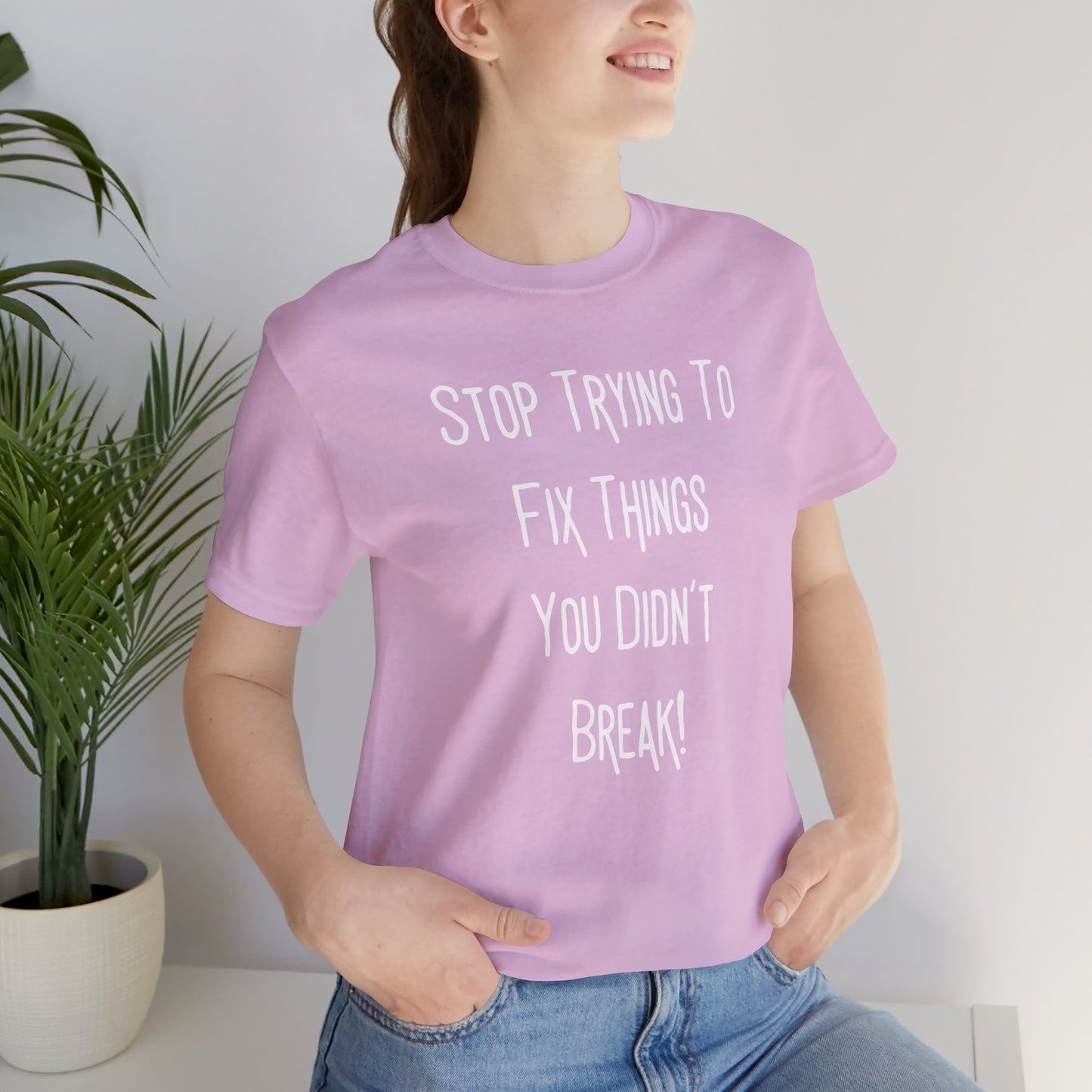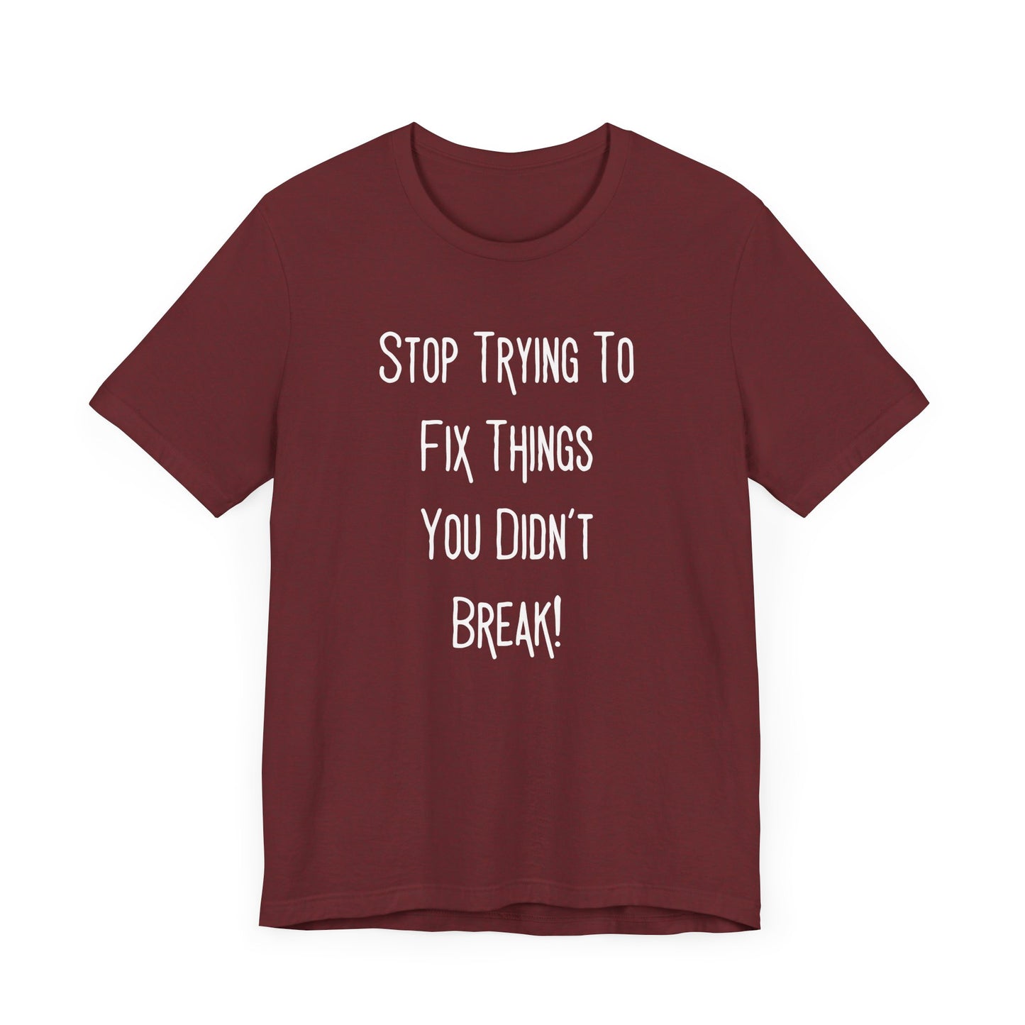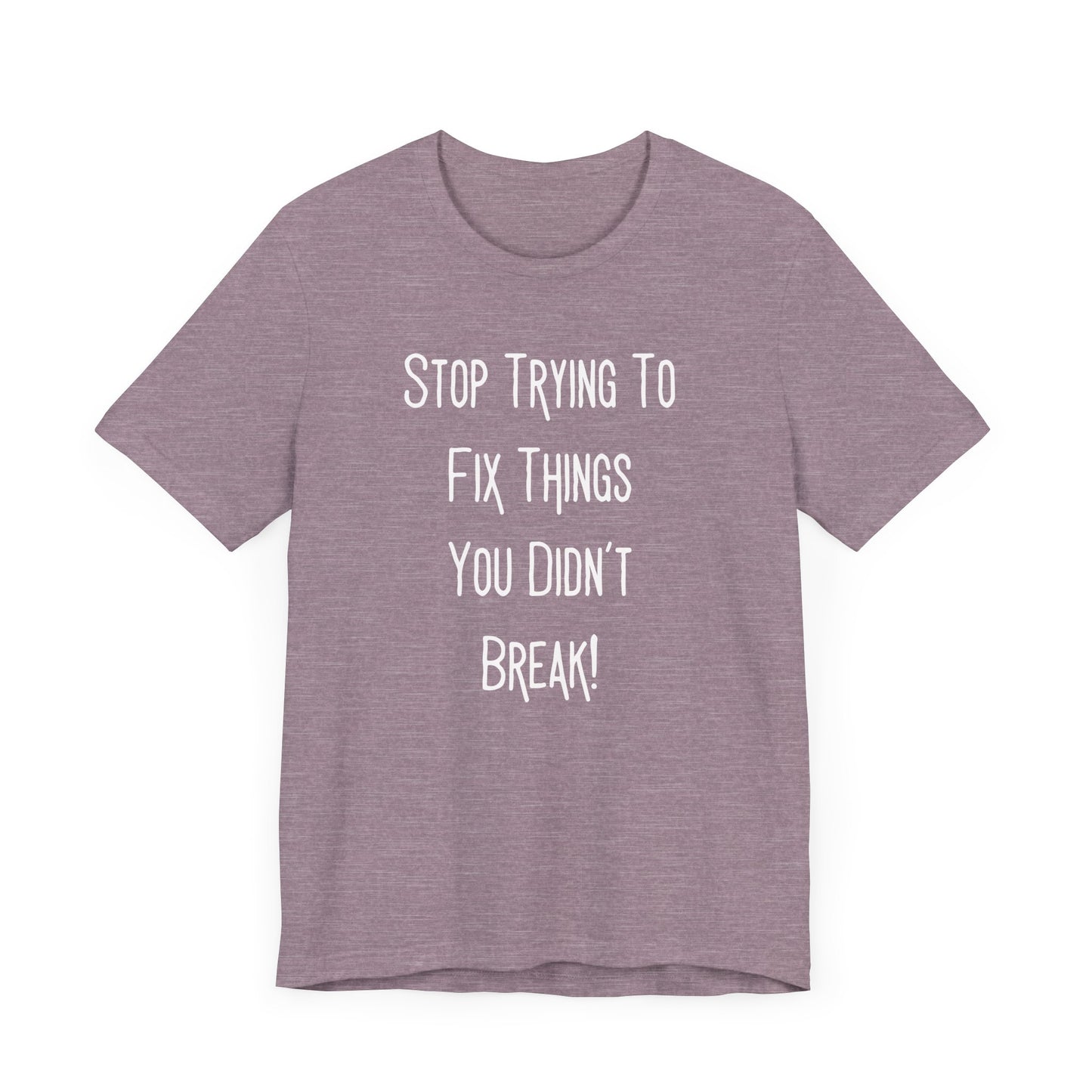 Stop Trying To Fix Things You Didn't Break. White Print Unisex Jersey Short Sleeve Tee