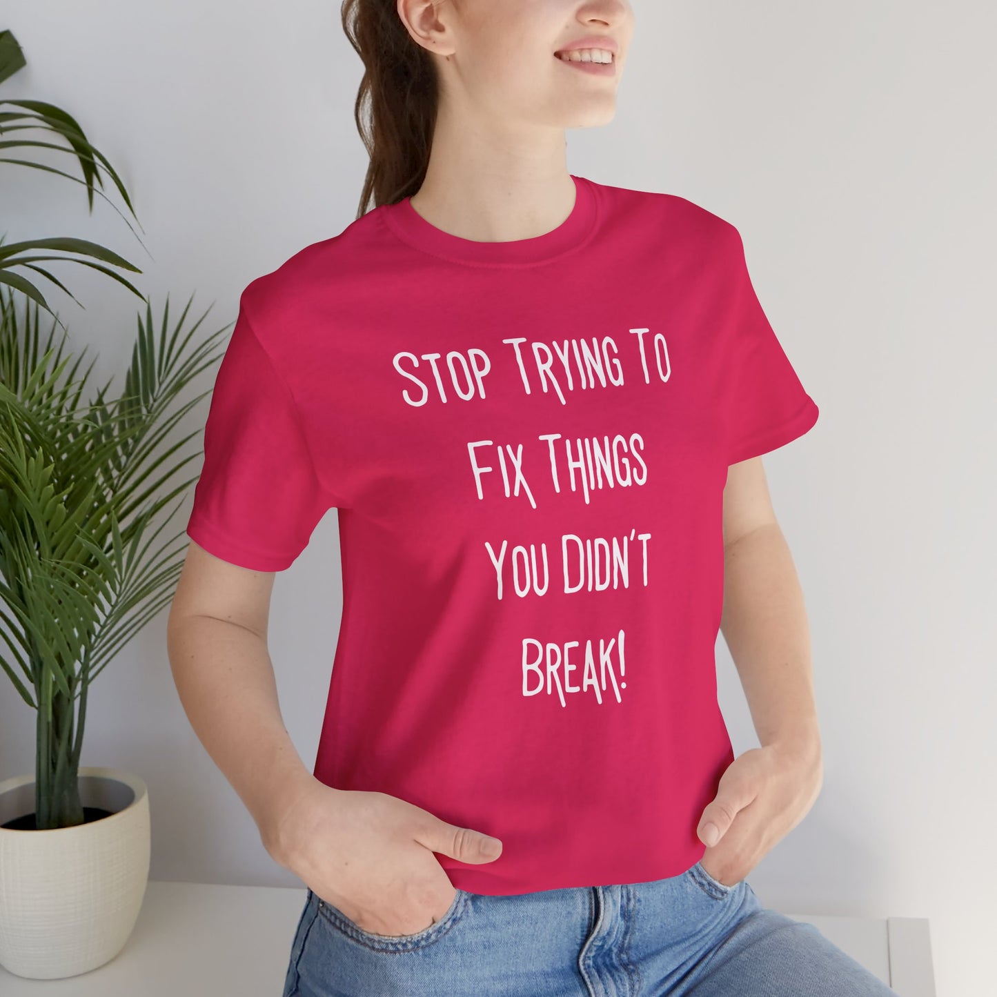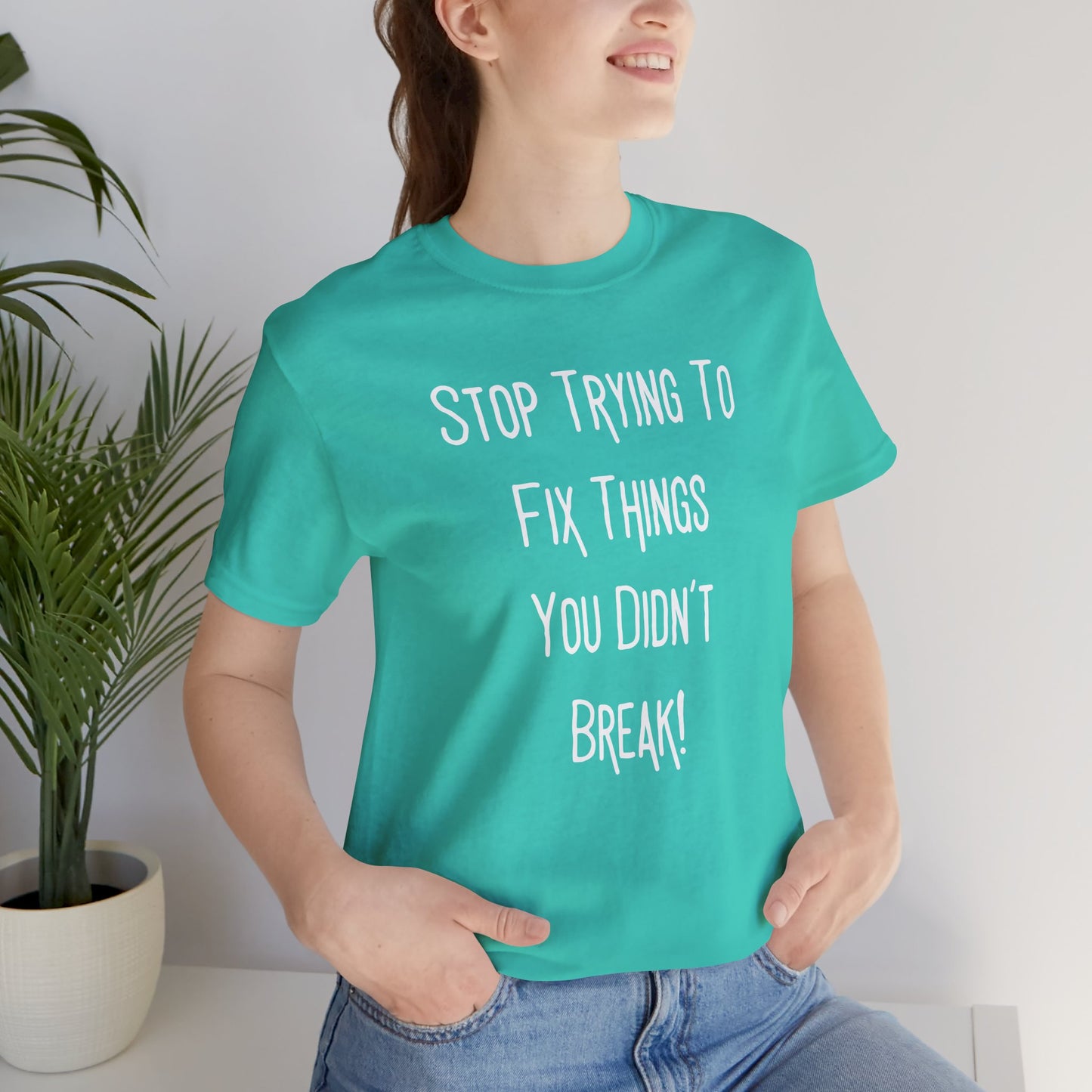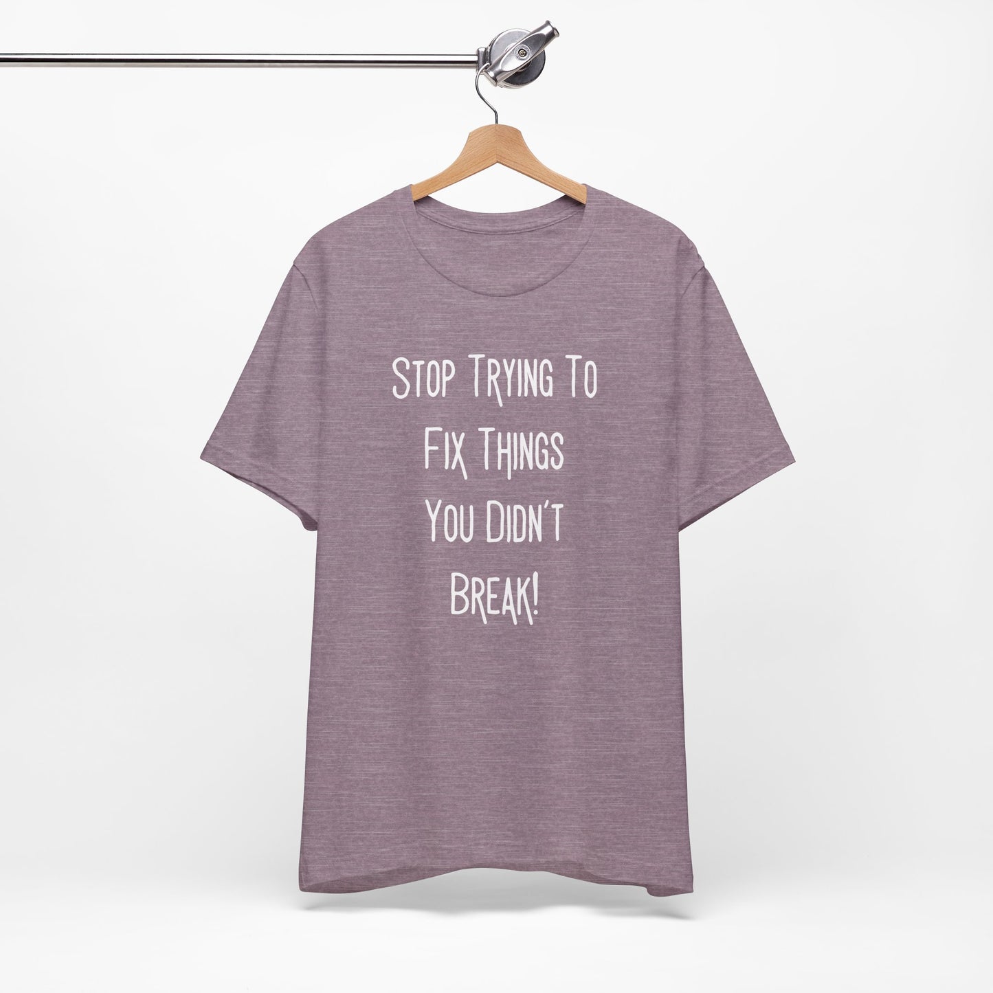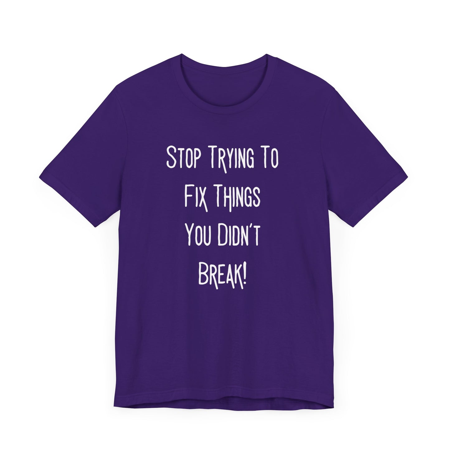 Stop Trying To Fix Things You Didn't Break. White Print Unisex Jersey Short Sleeve Tee