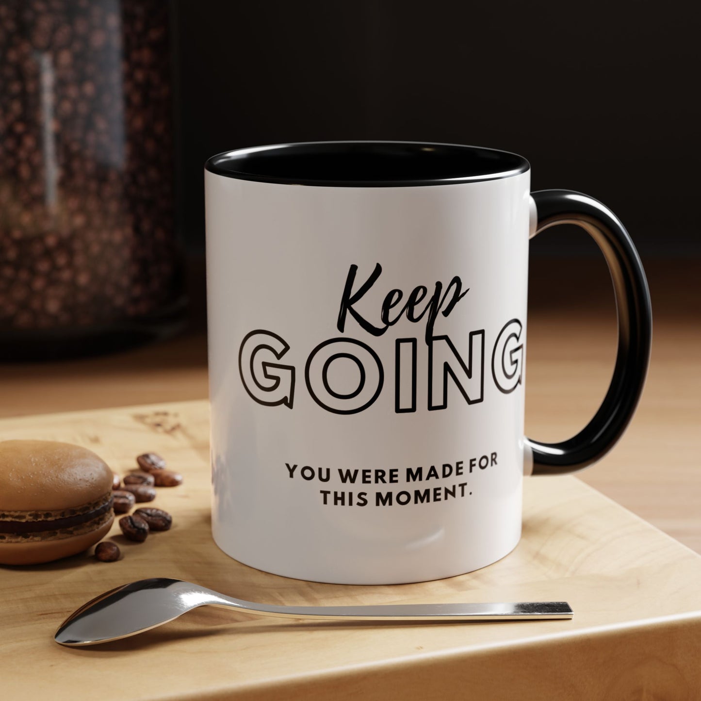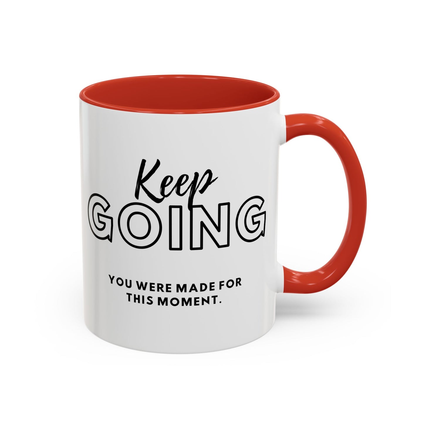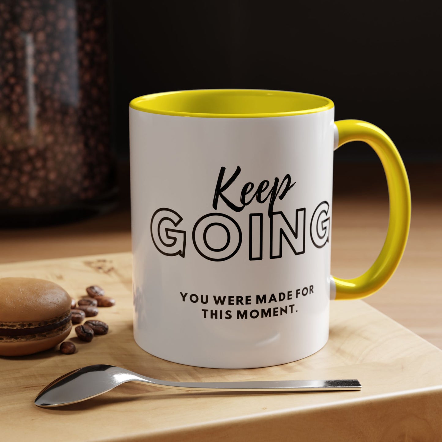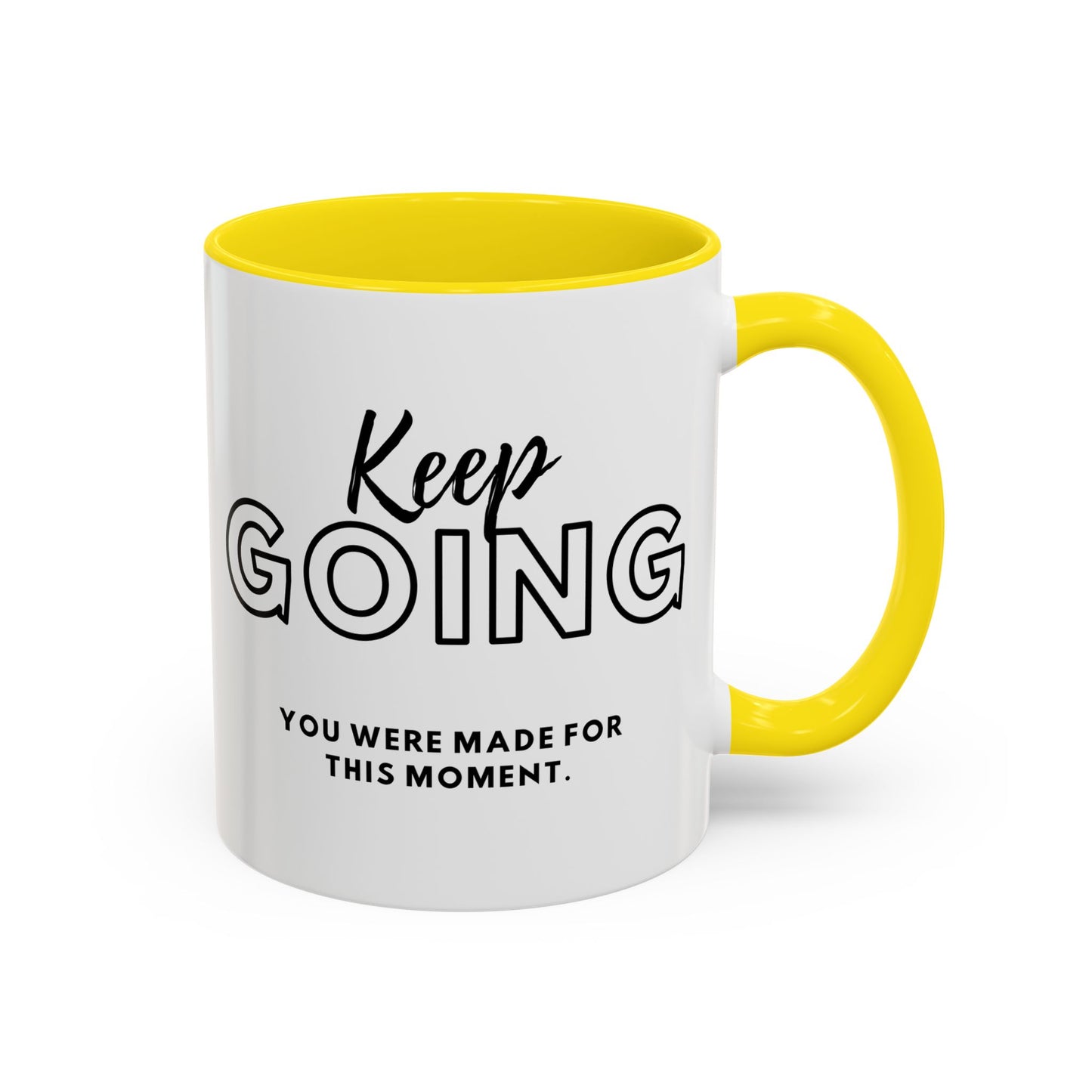 Keep Going You Were Made For This Moment!. Introducing our vibrant Accent Coffee Mug, perfect for those who thrive on motivation and positivity. This mug inspires you to keep going in every sip, making it an ideal companion for your morning coffee or afternoon tea breaks. With its eye-catching color contrast and fun design, this mug brings a spark of joy to your daily routine. It's suitable for anyone who enjoys a little encouragement in their life or wants to uplift others. Great for celebrations like birthdays, new beginnings, or even as a thoughtful gift during holidays like Christmas and Easter. Enjoy your drinks in style and let this mug brighten your day!