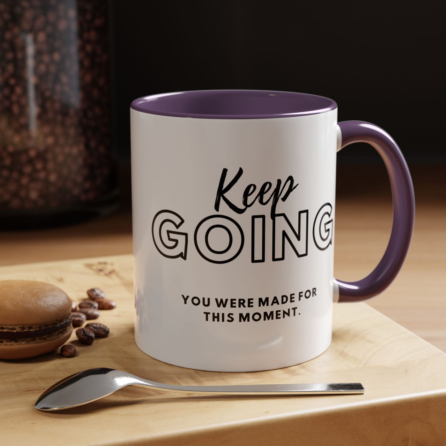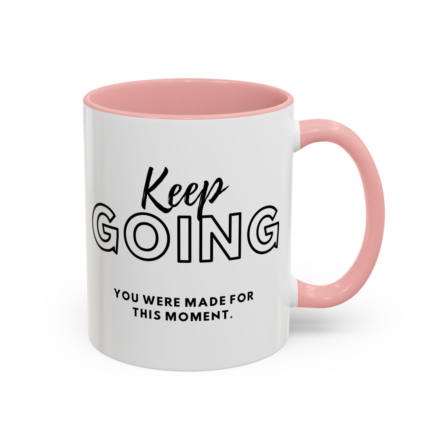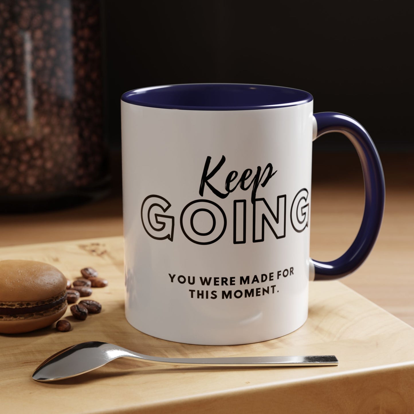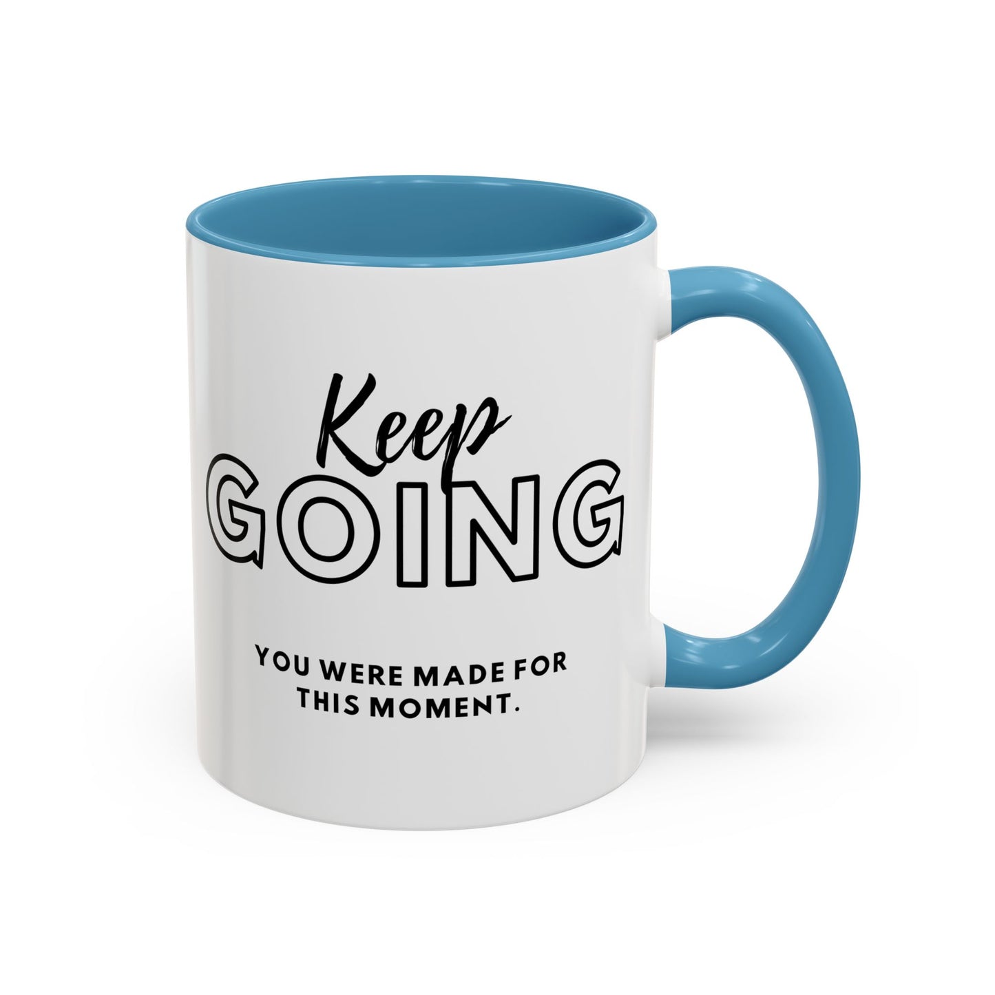 Keep Going You Were Made For This Moment!. Introducing our vibrant Accent Coffee Mug, perfect for those who thrive on motivation and positivity. This mug inspires you to keep going in every sip, making it an ideal companion for your morning coffee or afternoon tea breaks. With its eye-catching color contrast and fun design, this mug brings a spark of joy to your daily routine. It's suitable for anyone who enjoys a little encouragement in their life or wants to uplift others. Great for celebrations like birthdays, new beginnings, or even as a thoughtful gift during holidays like Christmas and Easter. Enjoy your drinks in style and let this mug brighten your day!