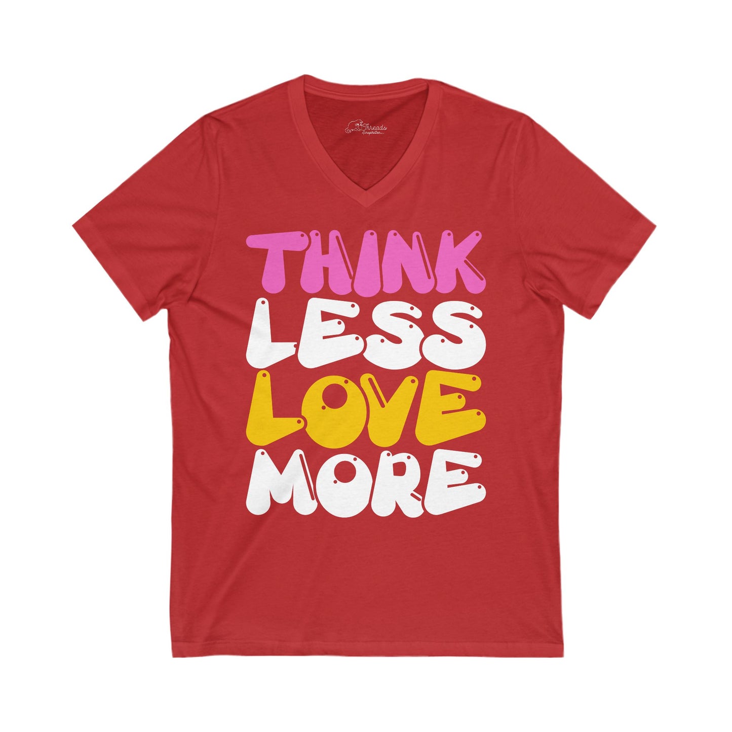 Think Less Love More T-shirt. Unisex Jersey Short Sleeve V-Neck Tee